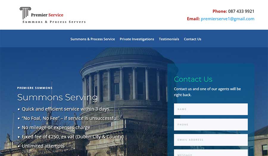 Premier Summons, a distinguished court summons serving and private investigations firm based in Ireland, sought to revamp its digital presence with a new website. Tasked with this mission, Nuasoft Web Design aimed to create a site that would not only reflect the professionalism of Premier Summons but also enhance user experience through innovative design features.